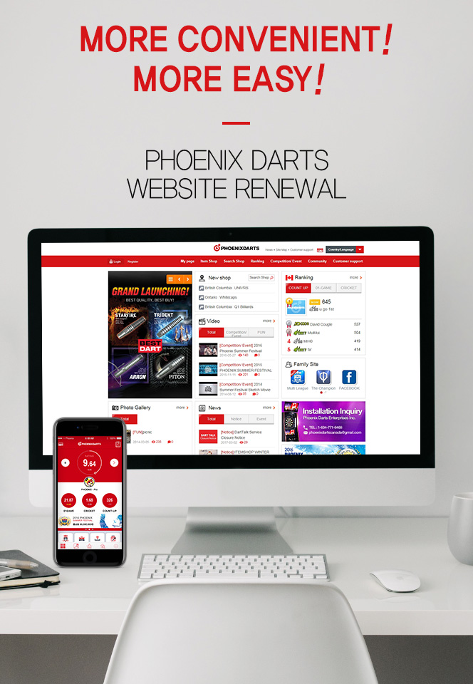 [Notice] PHOENIX DARTS WEBSITE RENEWAL OPEN! 2017-03-24 PHOENIX DARTS, Global No.1 Electronic Darts Brand, introduces NEW BRAND LOGO on March 23rd 2017. At the same time, PHOENIX DARTS WEBSITE and APP is updated with simpler and more stylish look. Check for yourself and Enjoy NEW PHOENIX DARTS! ÉVÉNEMENT D’OUVERTURE DU NOUVEL ITEM SHOP ▲ 2025-10-31 ▼ DartTalk Service Closure Notice 2017-03-02 List