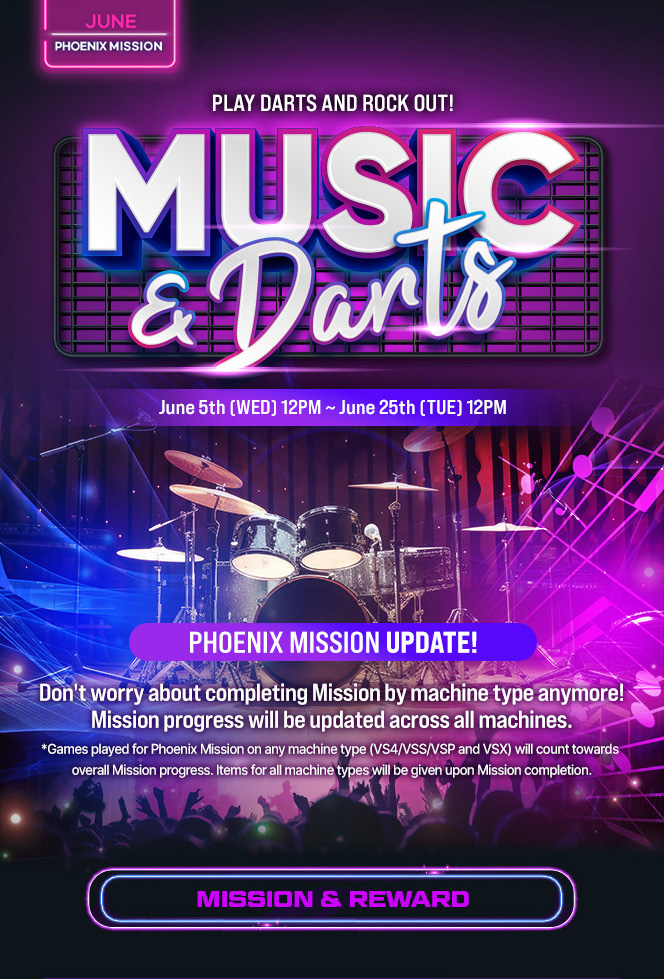 [Event] June Phoenix Mission: DARTS & MUSIC 2024-05-23 ÉVÉNEMENT D’OUVERTURE DU NOUVEL ITEM SHOP ▲ 2025-10-31 ▼ BATTLE DARTS GLOBAL BETA TEST BONUS STAGE 2024-05-03 List