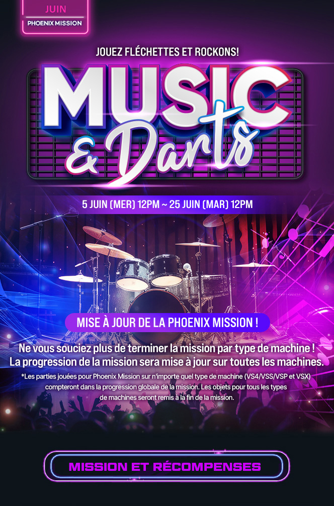 [Event] Mission Phoenix de Juin : DARTS & MUSIC 2024-05-23 ÉVÉNEMENT D’OUVERTURE DU NOUVEL ITEM SHOP ▲ 2025-10-31 ▼ June Phoenix Mission: DARTS & MUSIC 2024-05-23 List