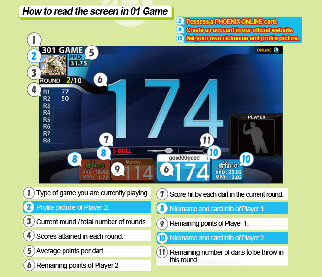 Players must throw three darts in each round, and reduce the amount of their remaining points to 0 points.