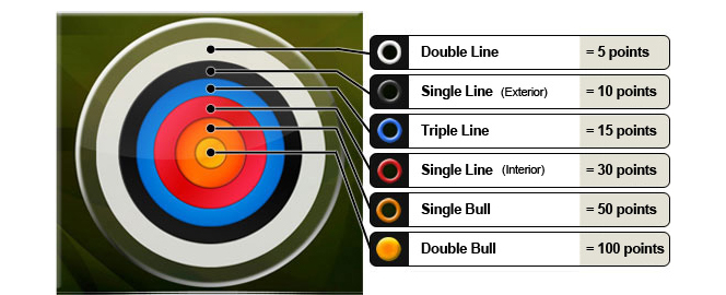 Points vary according to the lcoation of each target.Higher scores are given as the target is closer to the bull's eye.
