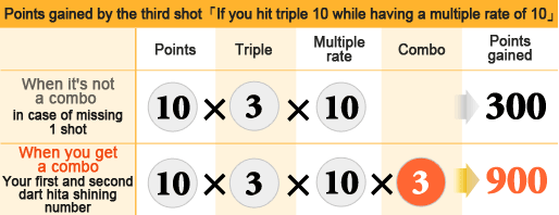〆Key PointIt is important to increase your multiplier as soon as possible.Leave Combos aside and go for triples to increase your multipliers.Once you are happy with your multipliers, then do your best to pile up combos.Try to make rooms on your 3rd dart of every round for bullseyes as it grants combos for triple score!