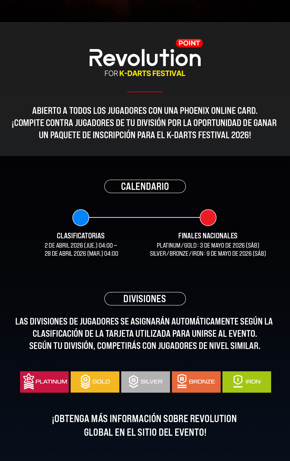 Clasificatorias de Revolution 2 de abril 2026 (jue.) 04:00 ~ 28 de abril 2026 (mar.) 04:00 Todos los titulares de tarjetas Phoenix Online Tiendas con máquinas VSX, VS4, VSS o VSP