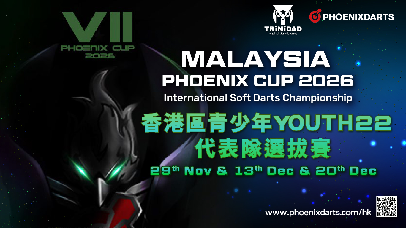 道場組得到千里達贊助,Phoenix Hong Kong將會於荃灣Allin@Inbull舉辦香港區青少年YOUTH22代表隊選拔賽,選出三男一女作為香港青少年代表隊參加KING of DARTS四人公開賽,22歲或以下的鏢手萬勿錯過!! 賽事將分三站進行, 三站總分排名最高的31女將代表香港出席MALAYSIA PHOENIX CUP 2026。獎品包括Malaysia The 7th Phoenix Cup 2026全餐報名費及三日兩夜酒店住宿。
