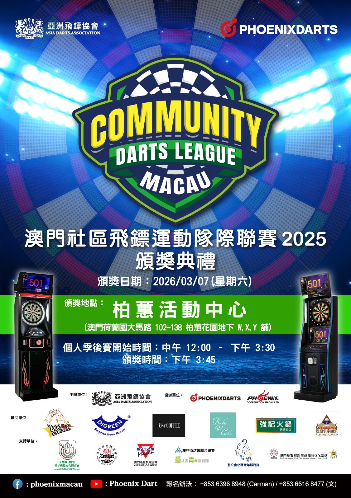 2025年度突破界限打造澳門首個社區飛鏢運動隊際聯賽,同時得到大家湧躍參加支持,並於早前已順利完成整個賽事;為鼓勵及表揚一眾參加者,將於2026年3月7日於澳門柏蕙活動中心舉行頒獎典禮,各隊伍獲得隊際賽的成果嘉許外,同時當天將會舉辦「社區飛鏢聯賽—個人季後賽」,勝出者將會獲得第20屆(ADA)國際錦標賽免費報名名額,為社區飛鏢運動建立更進一步的發展藍圖,歡迎各隊領隊及隊伍出席及誠邀大家親朋好友到場見證自己的成果。