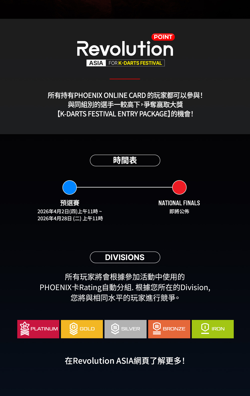 Revolution ASIA 預選賽 2026年4月2日(四)上午11時 ~ 2026年4月28日 (二) 上午11時 任何擁有並已註冊Phoenix Online Card的玩家。 有VSX、VS4、VSS或VSP機台的Phoenix設置店