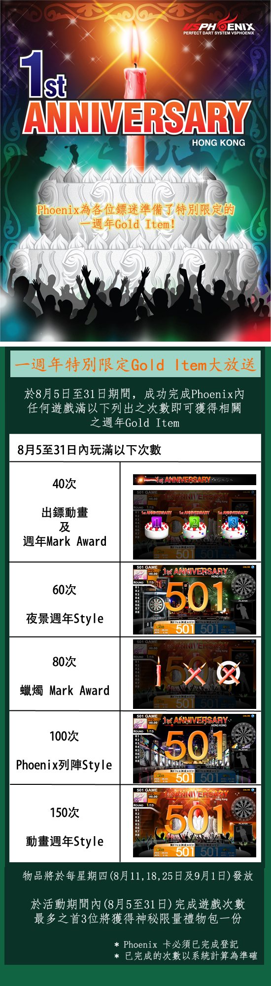 Phoenix週年特別限定Gold Item大放送已進入第三星期,承蒙各位鏢迷支持,已有超過50位鏢迷完成150次遊戲,並獲得動畫週年Wallpaper及所有特別限定Gold Item
