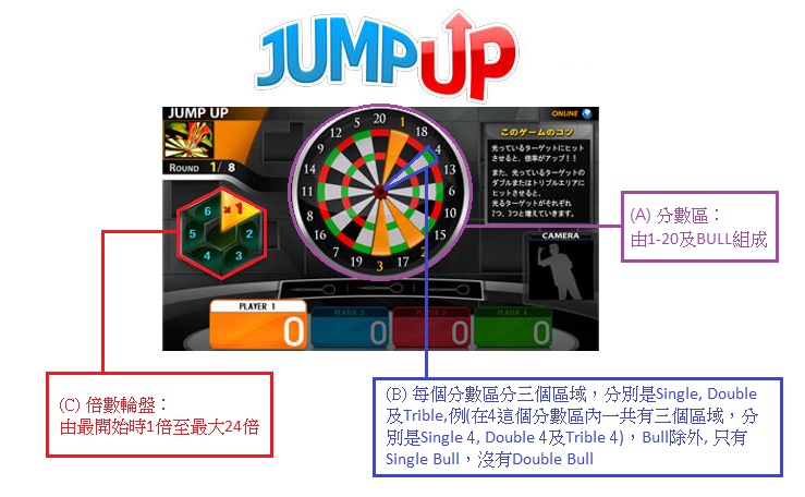每局Jump Up共有8個回合,每個回合有3次掟鏢機會,比賽最多可供4位玩家同時進行,由較高得分者勝出。