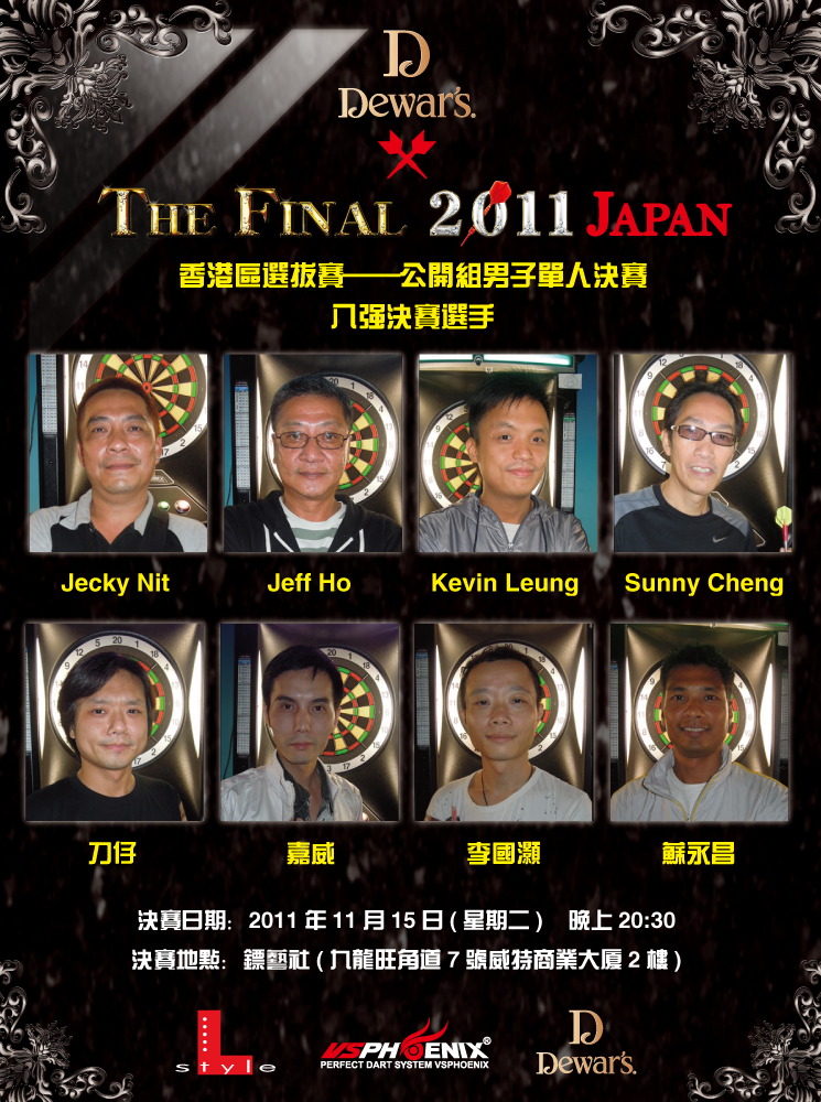 公開組男子單人決賽將會於1115日在鏢藝社舉行,歡迎各界朋友到場打氣支持,當晚之冠軍隊伍將可以代表香港參加The Final 2011 Japan之賽事,連4晚酒店住宿+來回日本機票。各晉級選手,加油!