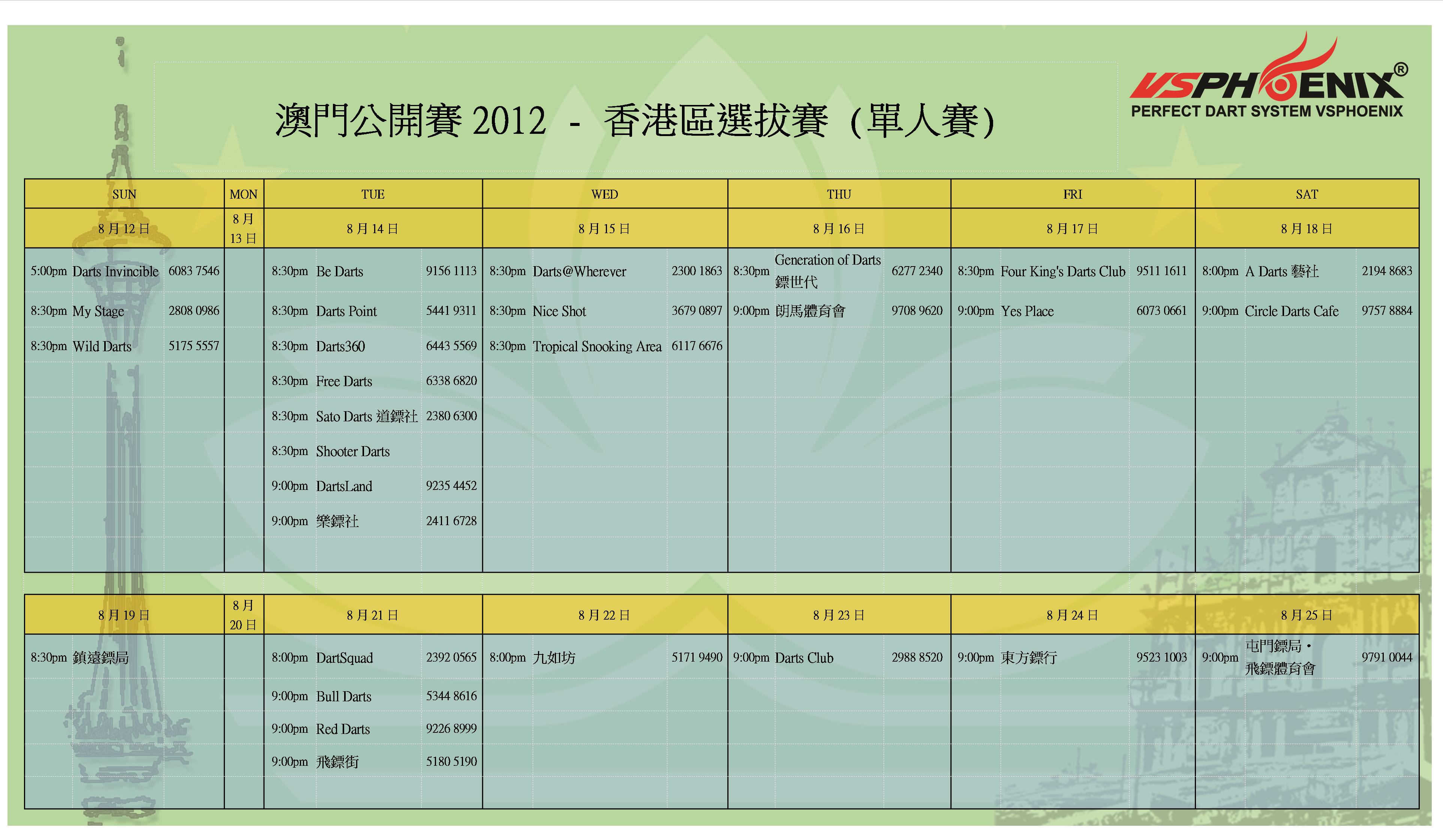 # (各場地初賽日期、時間有所不同, 請自行向場地查詢)