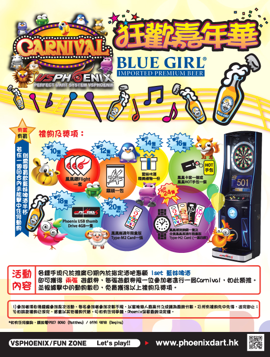 凡於指定酒吧惠顧 1Set 藍妹啤酒,即可獲贈 兩張 遊戲券,憑券可於即日參與Carnival嘉年華遊戲一次,擊中指定動物數量即可獲藍妹啤酒及Phoenix各款精美禮品。