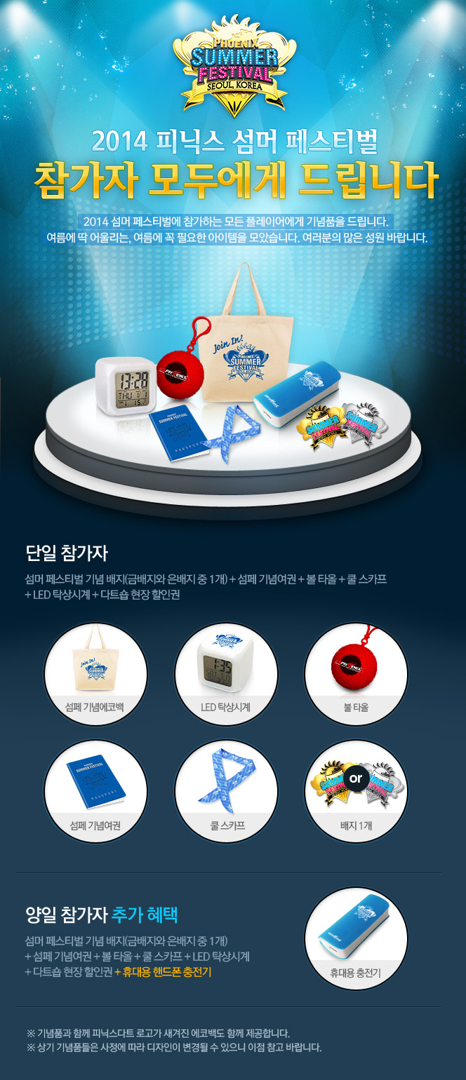 [공지] 2014 피닉스 섬머 페스티벌 참가자 모두에게 드립니다! 2014-05-23 섬머페스티벌 다른 공지 보기 2025 로드 투 퍼펙트 4차 대회 결과 ▲ 2025-11-18 ▼ 5월 New Item & Random Item arrived 2014-05-16 목록