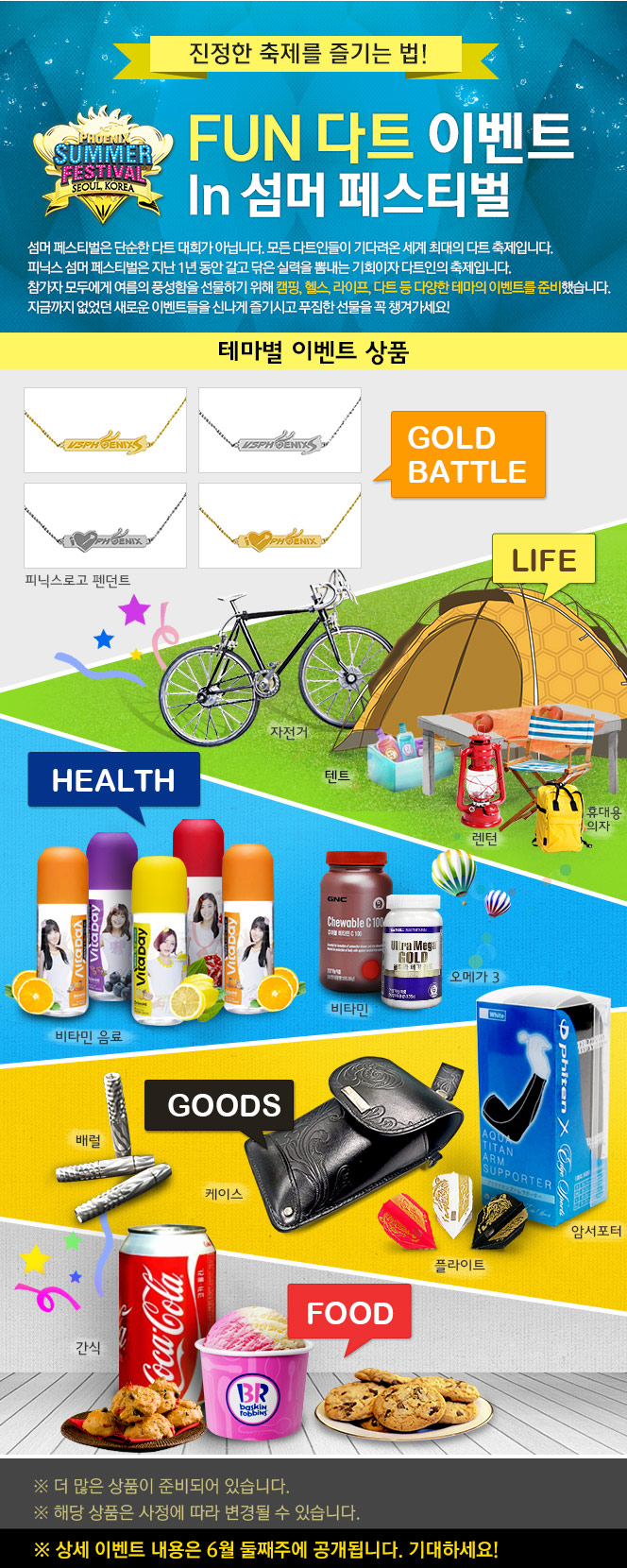 [공지] FUN 다트 이벤트 In 섬머 페스티벌 2014-05-23 섬머페스티벌 다른 공지 보기 2025 로드 투 퍼펙트 4차 대회 결과 ▲ 2025-11-18 ▼ 2014 피닉스 섬머 페스티벌 참가자 모두에게 드립니다! 2014-05-23 목록