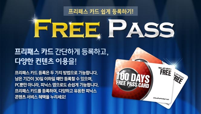 [공지] 프리패스 카드 쉽게 등록하기! 2014-06-25 <Mobile APP> Ver. 1 CLICK! 2 CLICK! 1 최근 플레이가 없어요! 가까운 숍에서 무료로 배포하는프리패스 카드 번호를 입력합니다. OR 2 최근에 게임을 했어요! 버튼만 누르면 등록 완료! <PC> Ver. 1 로그인 후 상단의 메인 메뉴에서 클릭 2 좌측 서브메뉴의 클릭 후 클릭 1 최근 플레이가 없어요! 가까운 숍에서 무료로 배포하는 프리패스 카드 번호를 입력합니다. 2 최근에 게임을 했어요! 버튼만 누르면 등록 완료! 2025 로드 투 퍼펙트 4차 대회 결과 ▲ 2025-11-18 ▼ 스타즈 프로모션 스케줄 (6.23~7.6) 2014-06-25 목록