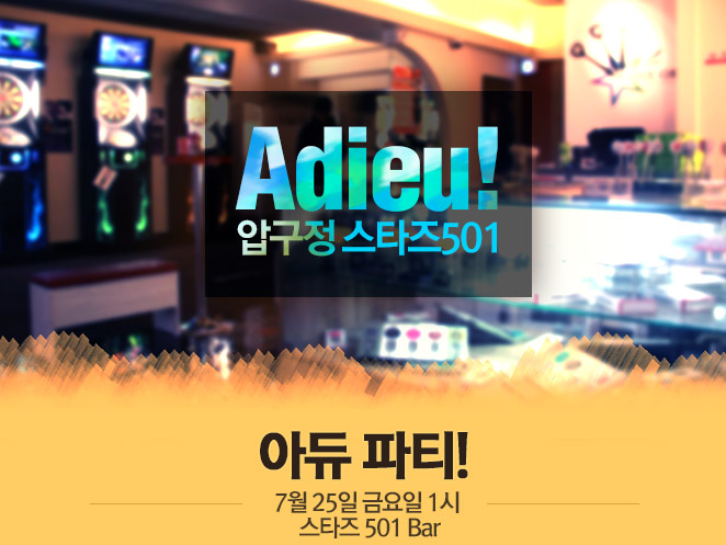 그동안 보내주신 플레이어 여러분의 "의리"에 보답하기 위해 7월 25일(금) "Adieu 스타즈501 Party"를 합니다. 모두 오셔서 추억을 나누고 아쉬움을 달래며, 새로운 시작을 기대하여 주십시오.