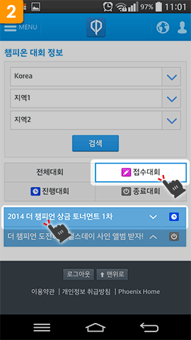③ 피닉스 온라인 카드를 터치한 후 대회의 상세 정보를 확인하고 참가 신청을 합니다.