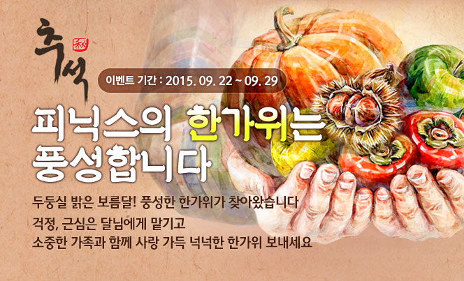 [이벤트] [Style Event] 피닉스의 한가위는 풍성합니다. 2015-09-21 ※ 미리 설정한 아이템이 없거나 카드를 터치하지 않으면 이벤트 아이템이 적용됩니다.(설정 아이템이 있으면 이벤트 아이템은 보이지 않습니다) 2025 로드 투 퍼펙트 4차 대회 결과 ▲ 2025-11-18 ▼ 더 챔피언 추석 이벤트 한가위 大폭발 결과발표 2015-09-18 목록