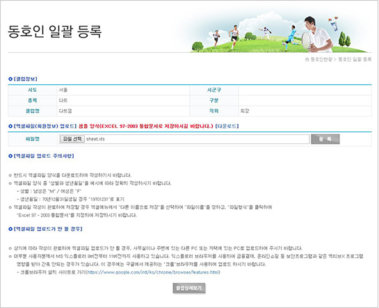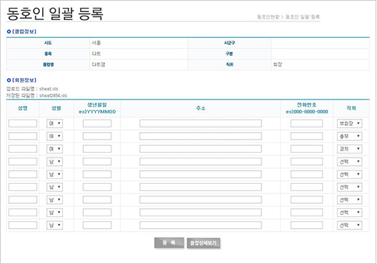 - 6. 동호인 일괄등록(엑셀파일다운) 또는