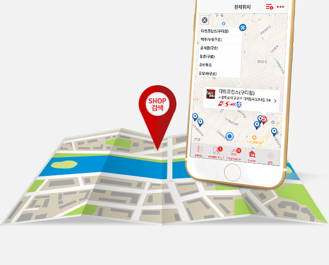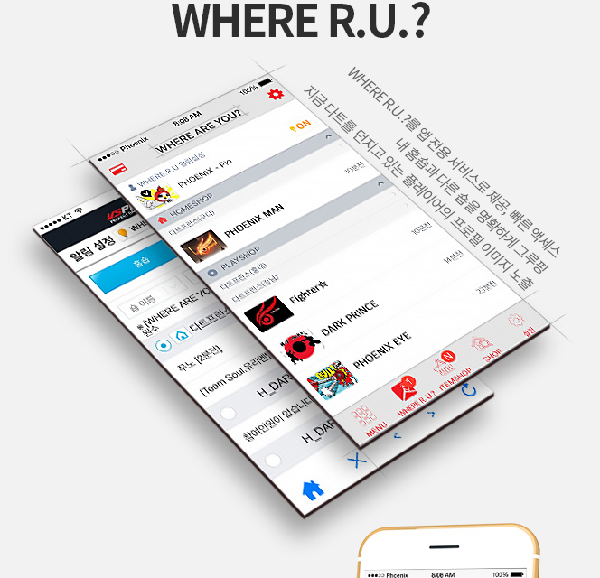 피닉스 숍을 쉽게 검색하고, WHERE R.U.? 로 친구를 찾아 다트를 즐기세요!