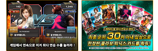 - - 이벤트가 끝난 뒤 캐릭터별 연승 순위 TOP30에 들어간 플레이어에게 해당 캐릭터 TEKKEN 501 온라인 카드를 드립니다.