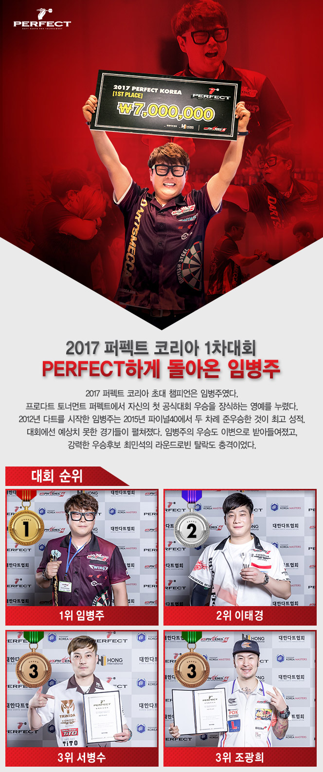 [이벤트] 2017 퍼펙트 코리아 1차대회 결과 2017-03-14 2025년 11월 다트플렉스 B클래스 토너먼트 ▲ 2025-11-14 ▼ 2016 하반기 피닉스리그 본선 일정 2017-03-09 목록