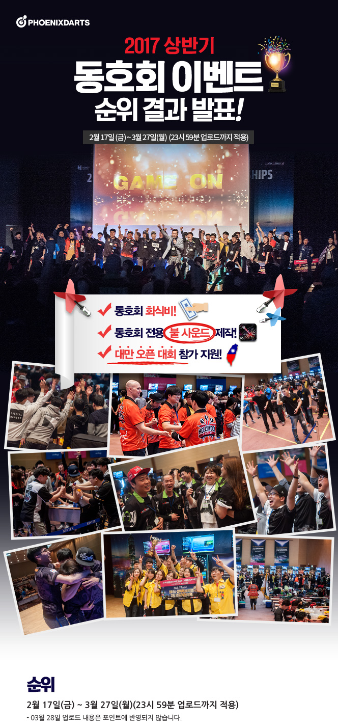 동호회 최강자전 참가 자격 부여 <동호회 최강자전> 1위: 대만 오픈 대회 참가 지원 (항공, 숙박, 엔트리비 포함) 8명 2위: 2017 섬페 엔트리권 8매 3위: 다트샵 상품권 30만원 * 일정과 장소 및 대회 내용은 추후 공지 * 32위 내 동호회 참가 불가 시 차 순위 동호회 참가 기회 부여 |