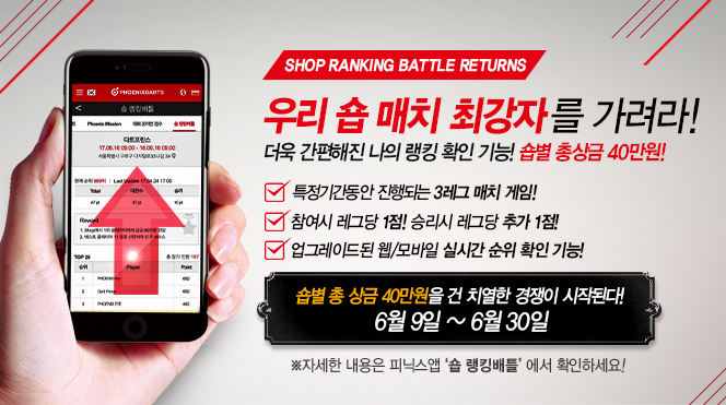 자세한 내용은 피닉스 앱 ‘숍 랭킹배틀’ 에서 확인하시거나 참가숍에 문의해주세요!