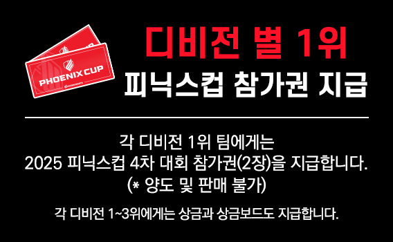 - ※ 각 디비전 1위에게는 2025 피닉스컵 4차 대회 참가권을 지급해 드립니다.(참가권은 양도 및 판매가 불가합니다.)