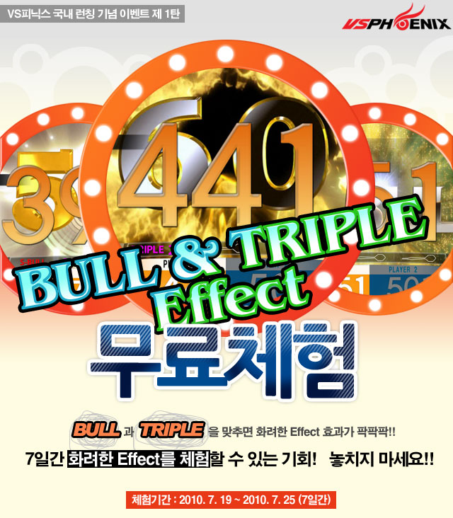 [공지] BULL&TRIPLE Effect 무료체험 2010-07-19 7일간이 체험기간 동안 BULL 과 TRIPLE을 맞추면 화려한 Effect 효과가 팍팍팍!! 2025 퍼펙트 코리아 8차 & 피닉스컵 4차 개요 ▲ 2025-11-19 ▼ Shop Promotion - 현장스케치 2010-07-15 목록