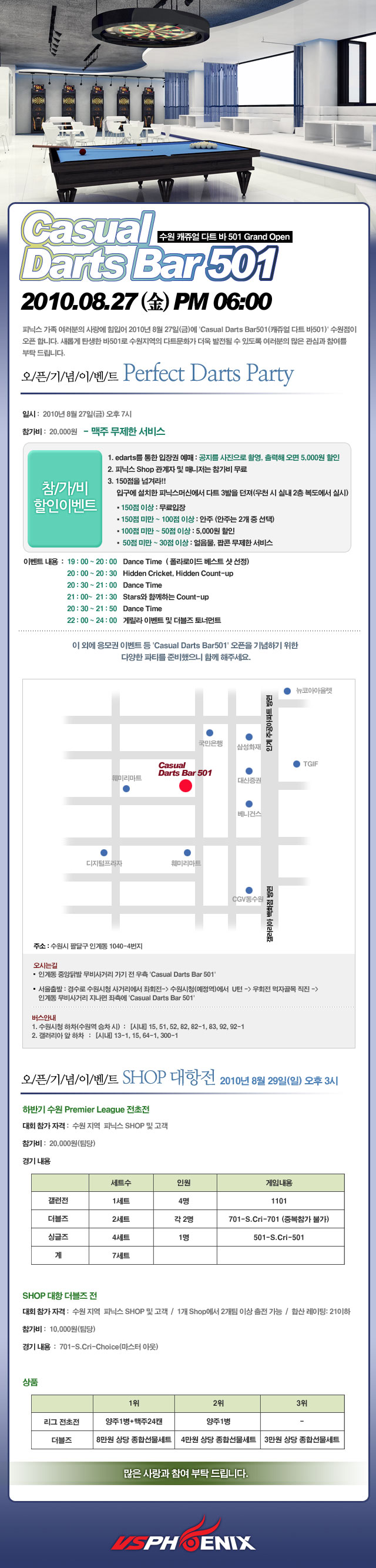 [공지] Casual Darts Bar 501 - 수원점 오픈 2010-08-23 2010년 8월 27일(금)에 Casual Darts Bar 501-수원점을 오픈합니다. 많은 관심과 참여 부탁드립니다. 2025 퍼펙트 코리아 8차 & 피닉스컵 4차 개요 ▲ 2025-11-19 ▼ edarts 30레이팅 변경 안내글 2010-08-18 목록
