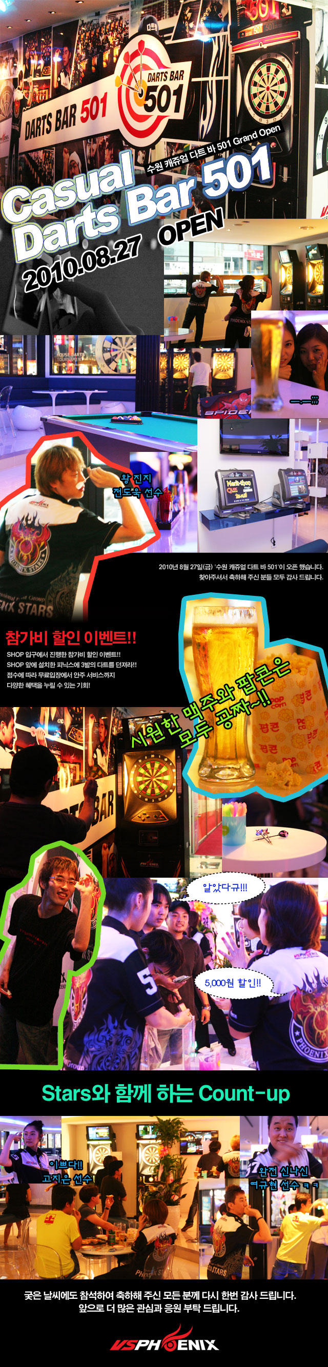 [공지] Casual Darts Bar 501 오픈 이벤트 2010-08-31 2010년 8월 27일(금) 수원 캐쥬얼 다트 바 501이 오픈 했습니다.찾아주셔서 축하해 주신 분들 모두 감사 드립니다. 2025 퍼펙트 코리아 8차 & 피닉스컵 4차 개요 ▲ 2025-11-19 ▼ 제4회 A Class 대회 - 후기 2010-08-23 목록