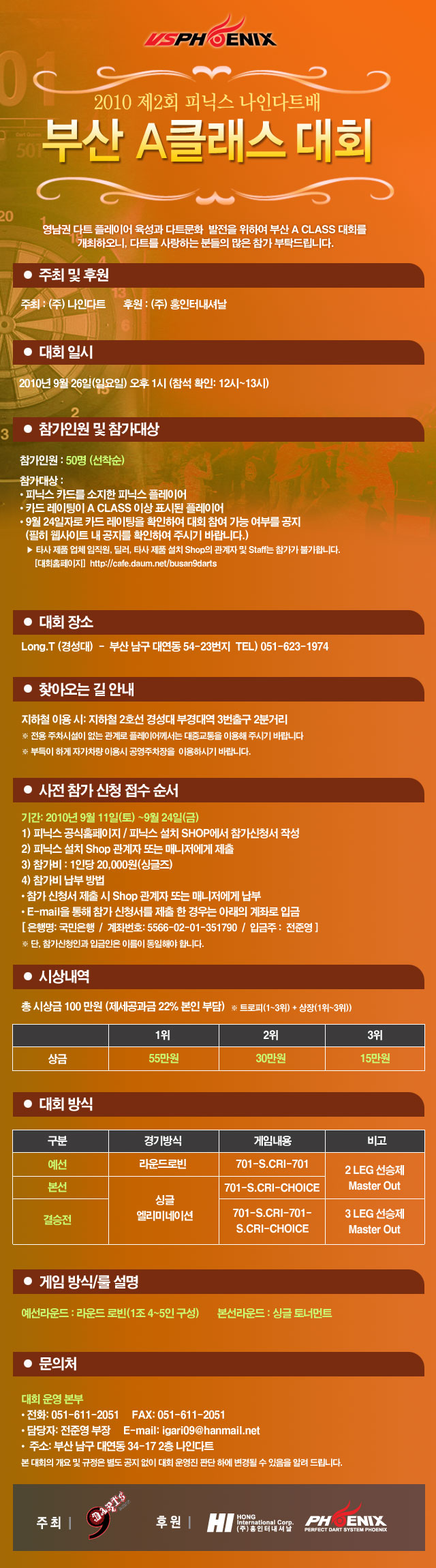 [공지] 2010 제2회 피닉스 나인다트배 부산 A CLASS 대회 2010-09-07 영남권 다트 플레이어 육성과 다트문화 발전을 위하여 부산 A CLASS 대회를 개최하오니, 다트를 사랑하는 분들의 많은 참가 부탁드립니다. 2025 퍼펙트 코리아 8차 & 피닉스컵 4차 개요 ▲ 2025-11-19 ▼ FUN!! VS피닉스 2010-09-03 목록
