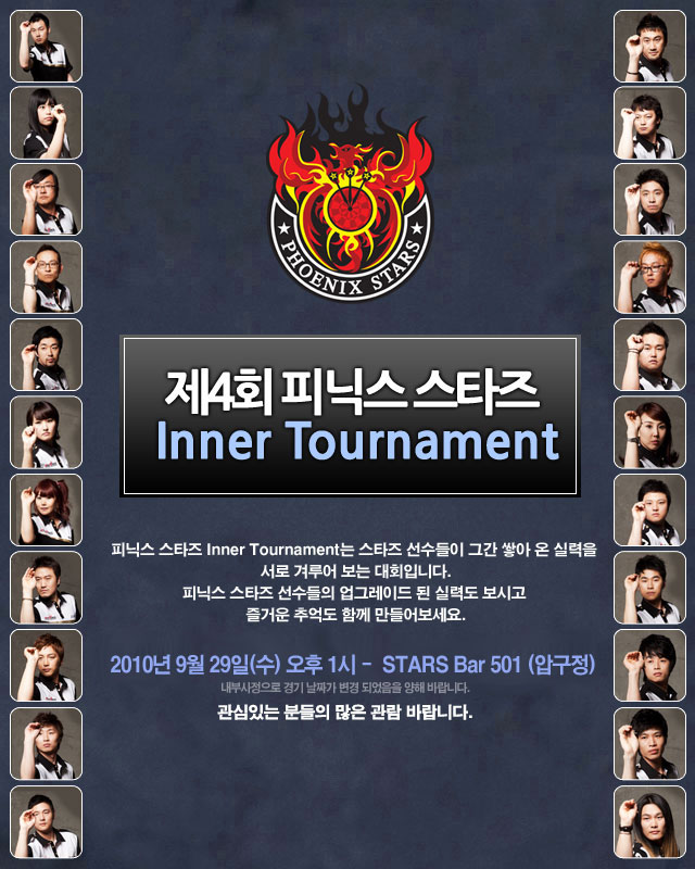 [공지] 제4회 피닉스 스타즈 Inner Tournament (날짜 변경) 2010-09-09 피닉스 스타즈 Inner Tournament는 스타즈 선수들이 그간 쌓아 온 실력을 서로 겨루어 보는 대회입니다. 2025 퍼펙트 코리아 8차 & 피닉스컵 4차 개요 ▲ 2025-11-19 ▼ 2010 제2회 피닉스 나인다트배 부산 A CLASS 대회 2010-09-07 목록