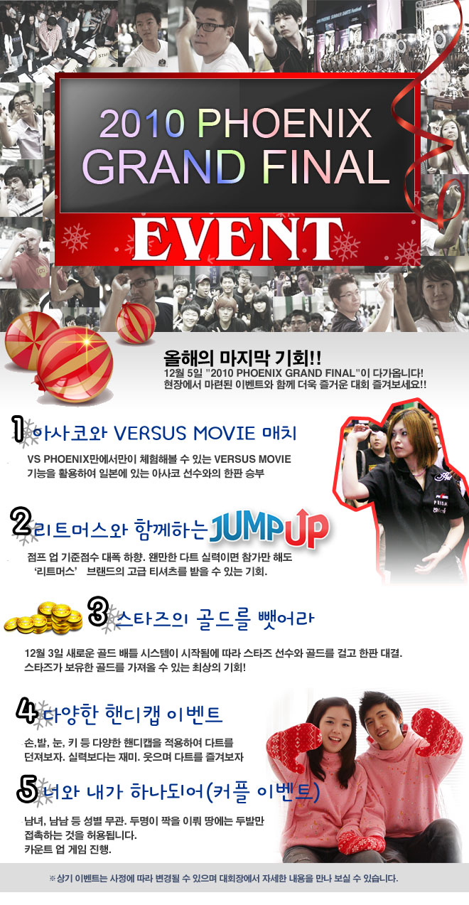 12월 5일 "2010 PHOENIX GRAND FINAL"이 다가옵니다. 현장에서 마련된 이벤트와 함께 더욱 즐거운 대회 즐겨보세요!