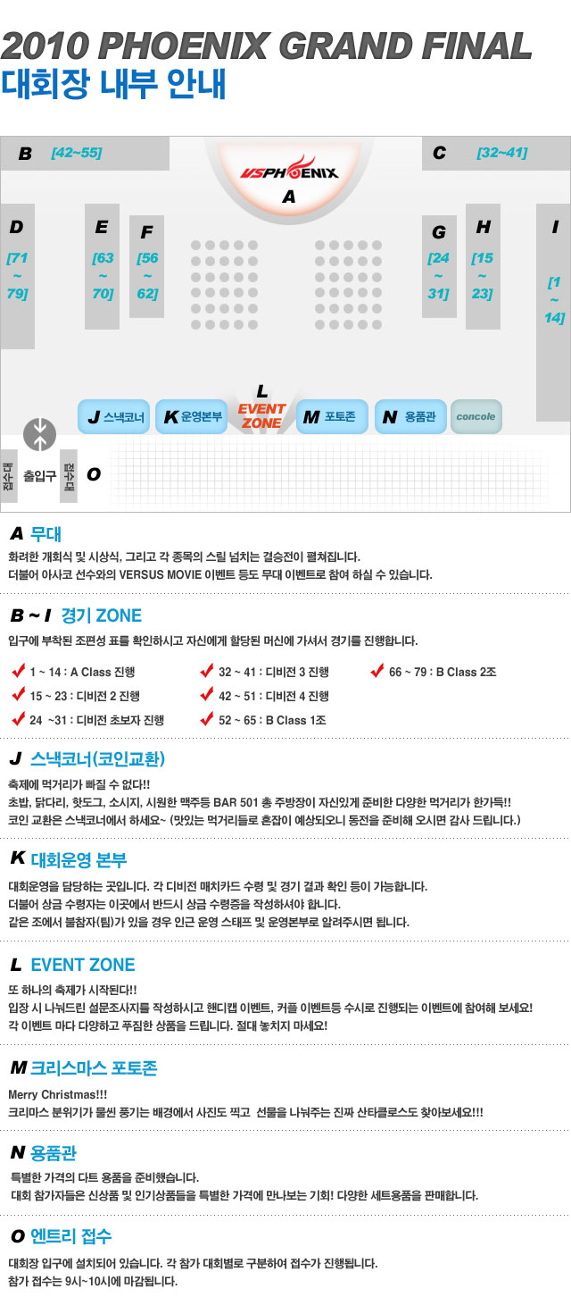 [공지] 대회장 내부 안내 - 2010 PHOENIX GRAND FINAL 2010-12-01 대회장 내부 안내, 조편성 표등 대회 참가 전에 미리미리 확인해주세요! 2025 퍼펙트 코리아 8차 & 피닉스컵 4차 개요 ▲ 2025-11-19 ▼ 2010 PHOENIX GRAND FINAL 조편성 2010-12-01 목록
