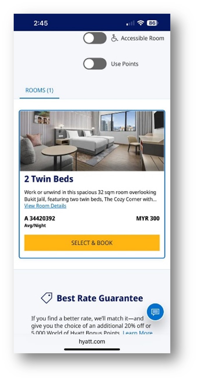 | Click on Booking Link | Select Date, Room and Guests | Select & Book (If prefer King Room, please contact us after booking done) |