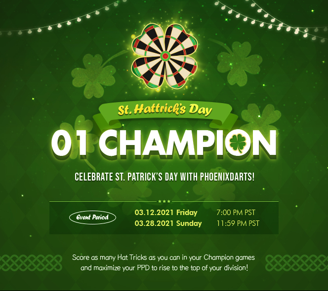 - -Players will earn 1 Raffle Ticket for every 10 Champion games played! 4 Raffle Ticket winners will be drawn after the St. Hattrick’s Day 01 Champion has ended and winners announced on our Facebook page (facebook.com/phoenixdartinc).