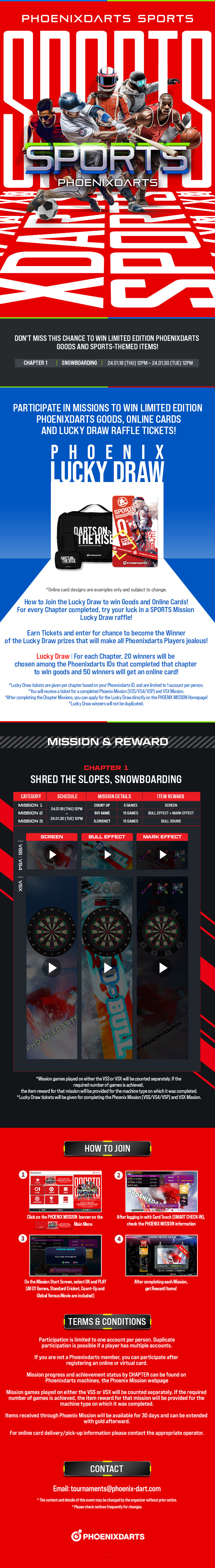 [Event] PHOENIXDARTS SPORTS | CHAPTER 1. SNOWBOARD 2024-01-16 HALLOWEEN ITEM EVENT ▲ 2025-10-16 ▼ Phoenixdarts Online Tournament: Trios 2024-01-11 List