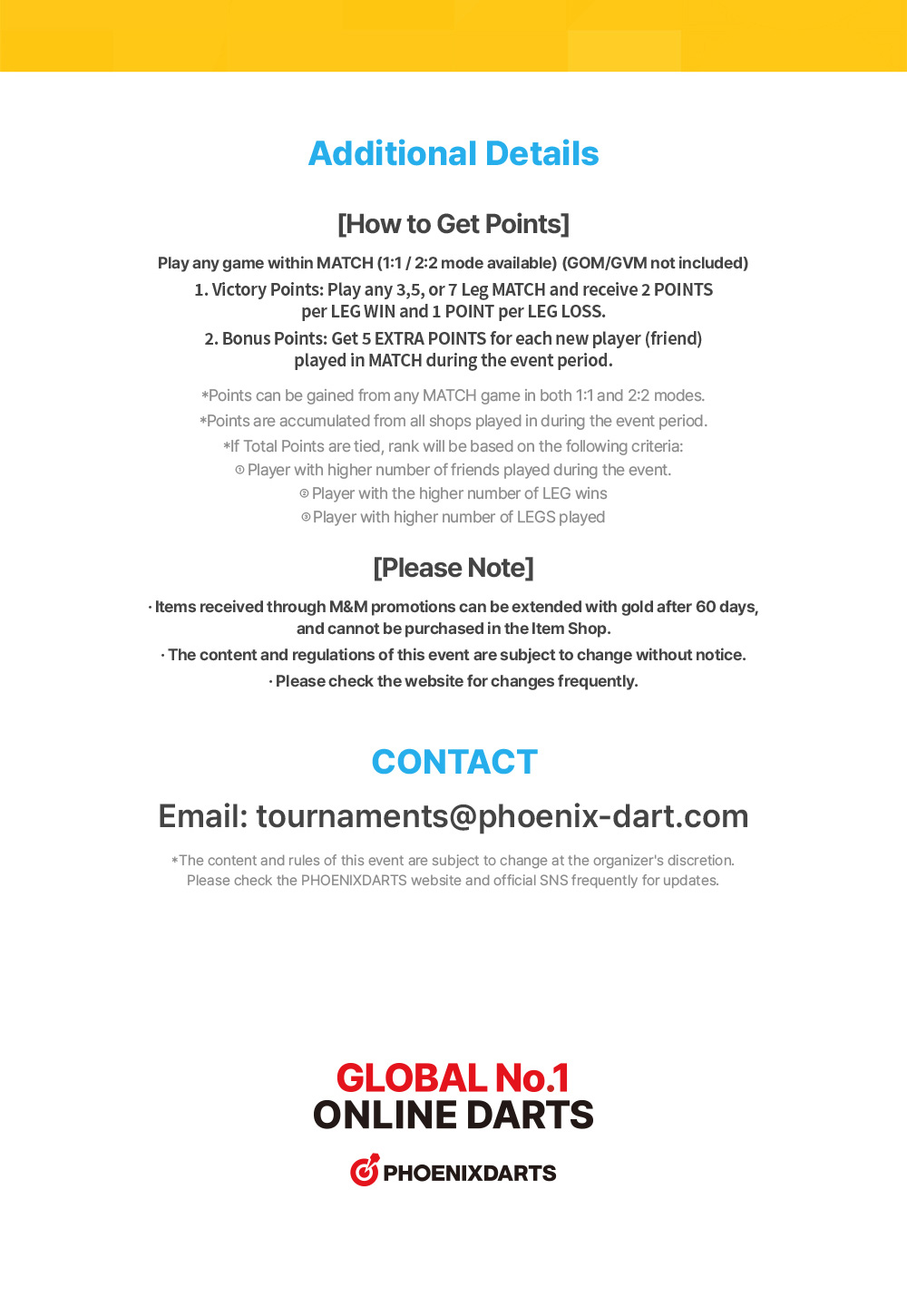 [Event] MEET & MATCH: Phoenixdarts Friends Project 2024-07-31 HALLOWEEN ITEM EVENT ▲ 2025-10-16 ▼ August Phoenix Mission: Welcome to the Jungle 2024-07-30 List