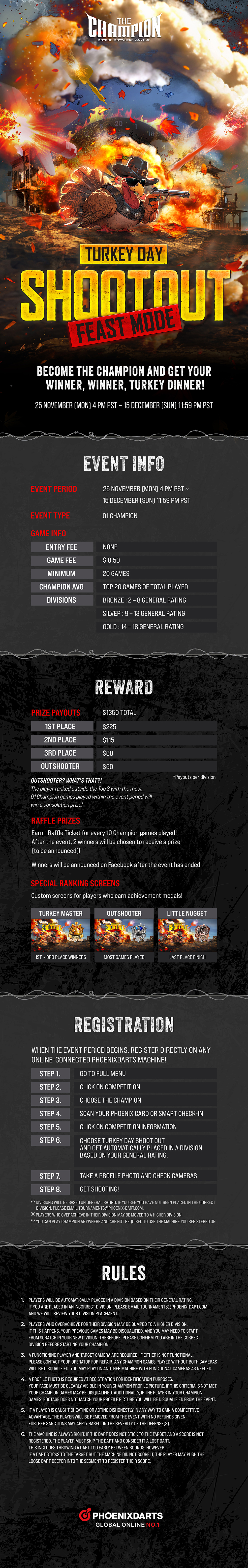[Event] 2024 Turkey Day Shootout Champion 2024-11-22 HALLOWEEN ITEM EVENT ▲ 2025-10-16 ▼ PHOENIXDARTS APP RENEWAL! 2024-11-19 List